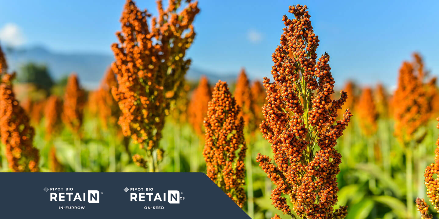 Sorghum crop in a field with the Pivot Bio Novator logo in the corner